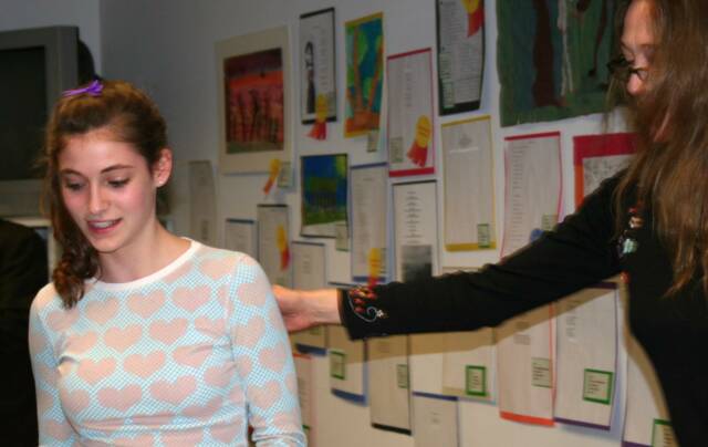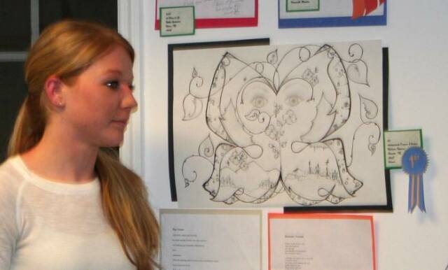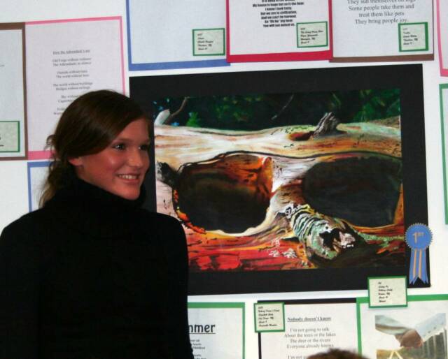Over one hundred friends and family gathered at the Old Forge Library to celebrate this year's Poetry and Illustration contest winners. The emcee for the evening was Michael Cunningham, Town of Webb English Teacher. Suzanne Firsching, Sculptor, presented the awards and prizes.