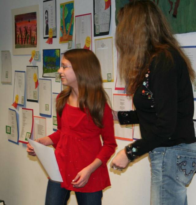 Over one hundred friends and family gathered at the Old Forge Library to celebrate this year's Poetry and Illustration contest winners. The emcee for the evening was Michael Cunningham, Town of Webb English Teacher. Suzanne Firsching, Sculptor, presented the awards and prizes.